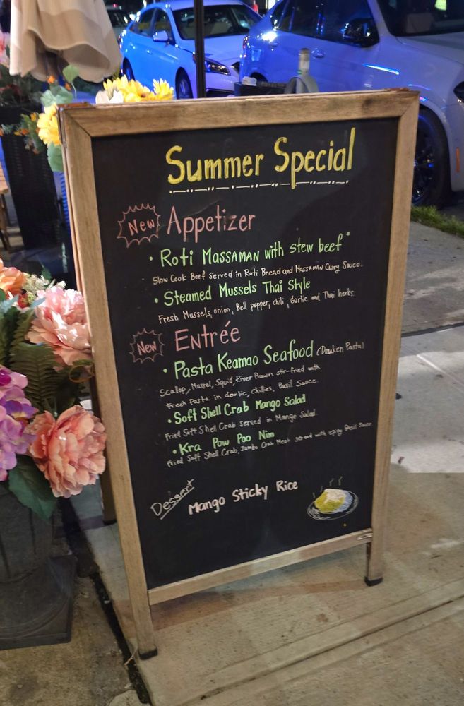 “ Parking was easy (metered parking right there, residential parking close by). The restaurant is a decent size, with a couple tables outdoor (was too chilly for that when I went). Service was friendly and quick. The food came out quick too! The Mango Salad had a lot of fresh mango and crisp veggies, paired perfectly with the sour lime and spicy dressing. The Crab Meat Fried Rice had a decent amount of lump crab meat. The fried rice was cooked well. The Thai Chili sauce is needed for added flavor. The Beef Short Rib Panang was seriously fall off the bone tender! The sauce had a good kick and went great with rice. I did wish for more carrot (only 1) and less sweet potato fries, as the fries lose their texture from sitting in the sauce. The carrot fares much better in the sauce than the fries. A must get though! The Thai Iced Tea was not too sweet, which I enjoyed. Great Thai spot to check out if you're in the area. I would come back for the Beef Short Rib Panang, and to try their other dishes. They do also have an extensive alcohol list! ”